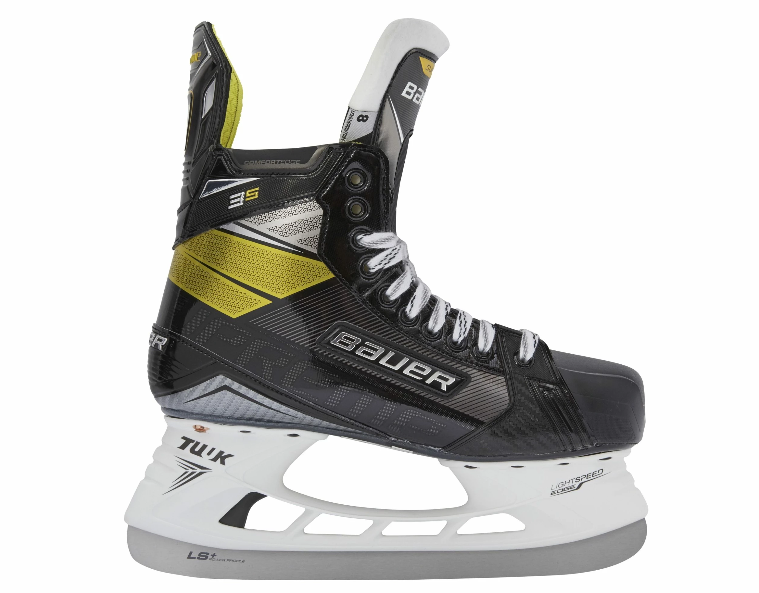 The Supreme 3S Skate is offered in our new Performance Fit System and it’s designed for the skilled player who wants added comfort. It features a 3D Lasted Flex Composite Boot that’s lightweight and easier to flex. Combined with a Pro TPU outsole, it offers additional stiffness in the lower portion of the skate, delivering more straight line speed. The boot also has a power cut which offers increased wrap for optimal foot stability and a more powerful stride. A Pro 48 ounce Felt Tongue with injected metatarsal guard compresses and releases energy, offering forward flex and comfort. The skate features a high grade LS+ stainless steel blade equipped with increased height AND Bauer’s Power Profile*, which helps the player maintain speed and a more aggressive stride. With a Flex Rating of 70, it also offers a great level of support and stability for the player. Also, in the Junior sizing, we’ve incorporated Motion Flex, a fiber composite boot, which helps a younger player get into the proper “knees over toes” position while still offering outstanding support.